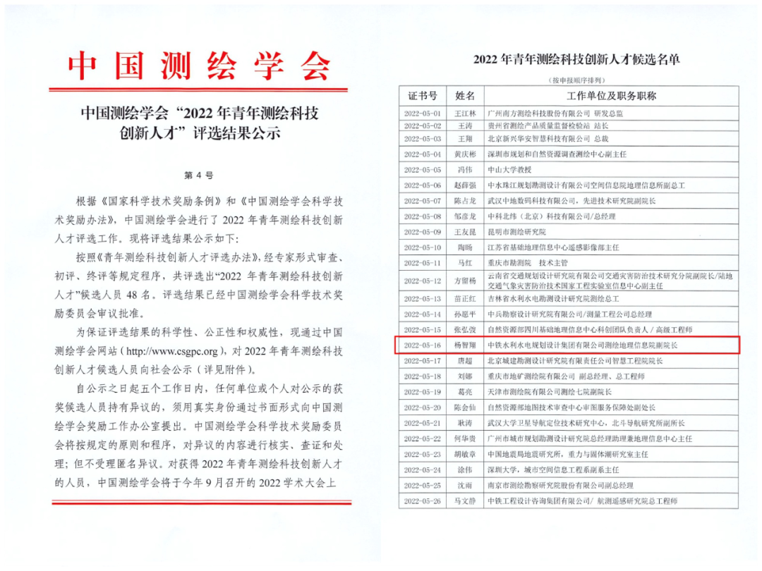 【喜报】杨智翔荣获2022年全国青年测绘地理信息科技创新人才奖