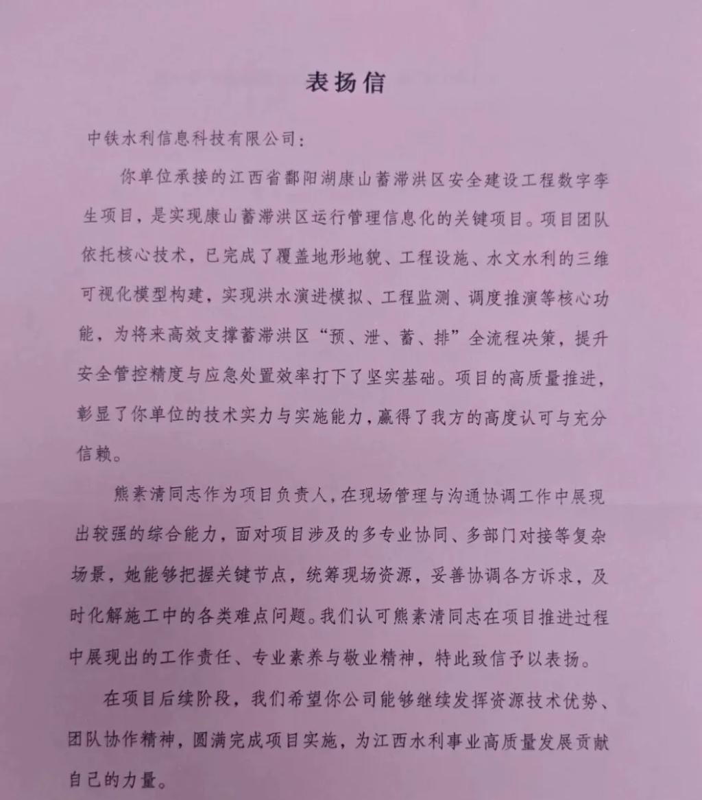 近日,集团公司收到由鄱阳湖蓄滞洪区(康山、黄湖)安全建设工程建设项目部发来的表扬信。信中对中铁水利信息承建的康山蓄滞洪区安全建设工程数字孪生项目高质量推进成效以及项目负责人展现的综合履职能力给予高度肯定与表扬。